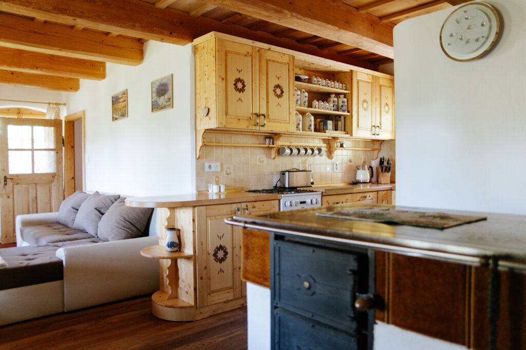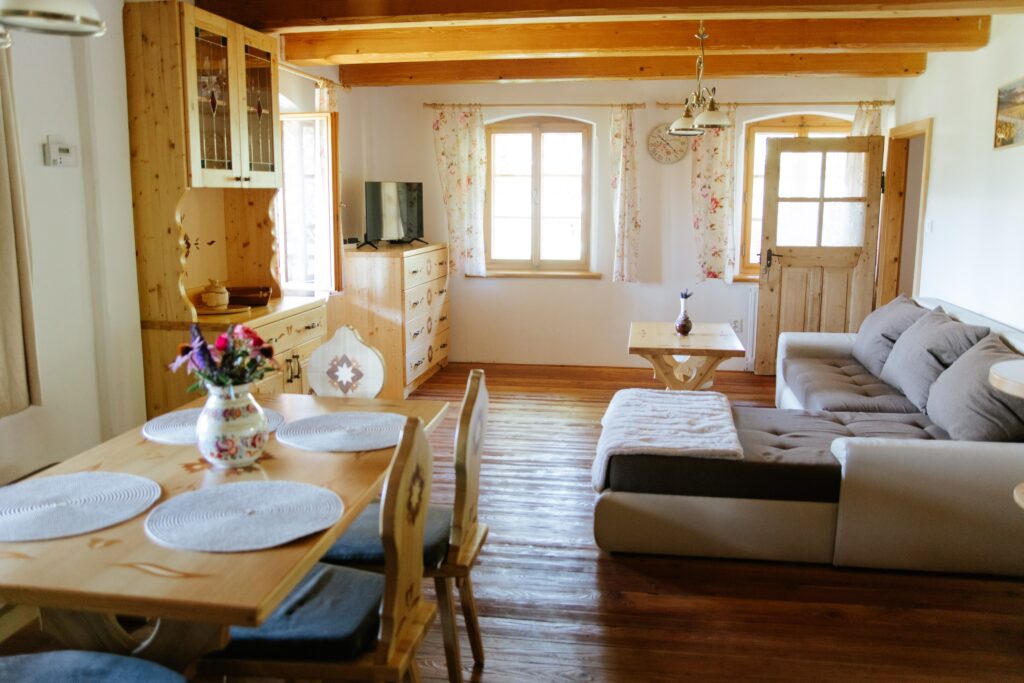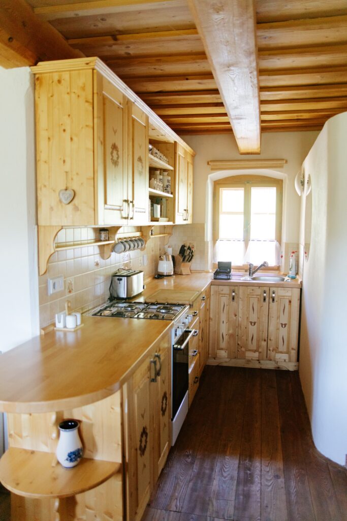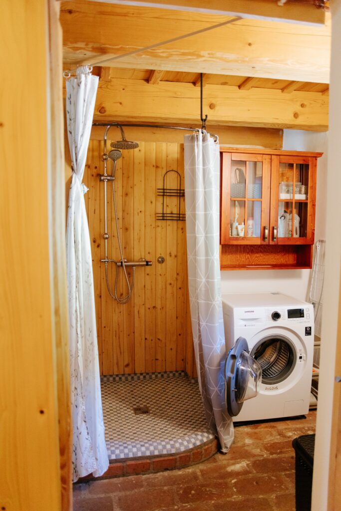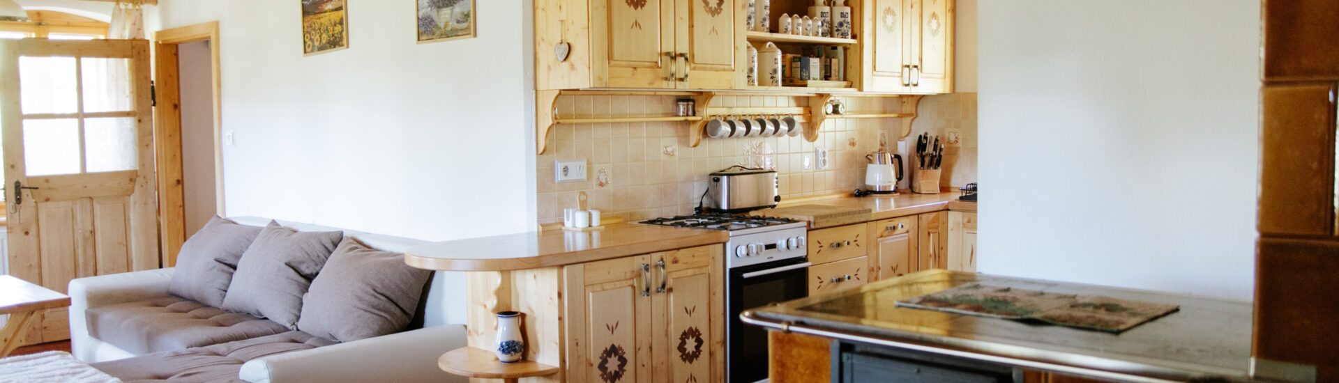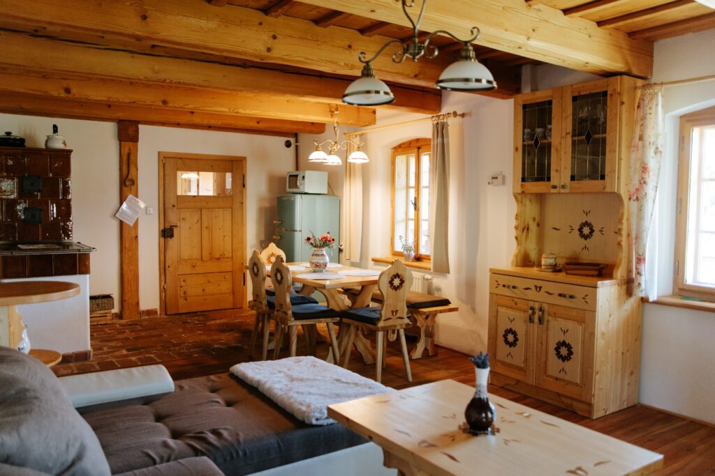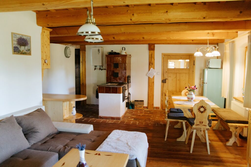 • Přízemí – Kuchyně s kachlovými kamny, jídelnou, spižírnou, obývací pokoj s pohovkou, WC, koupelna se sprchovým koutem, pračka (za poplatek), ložnice se dvěma lůžky.