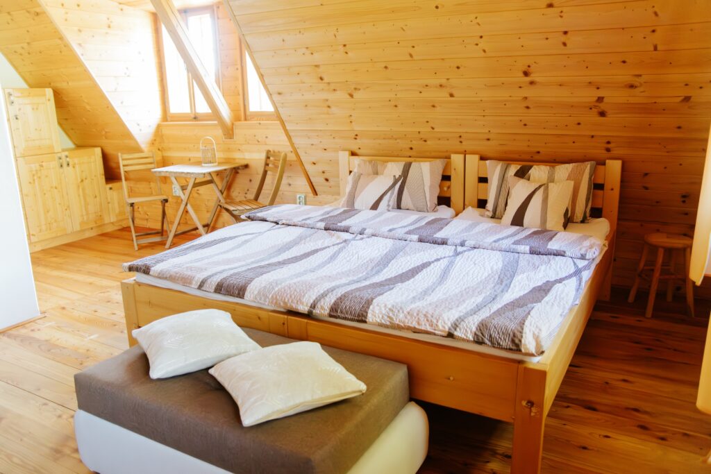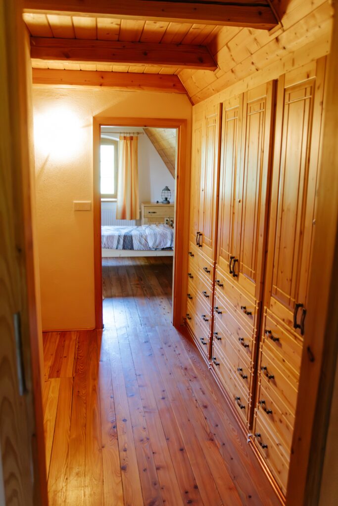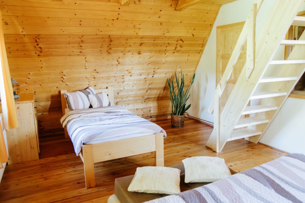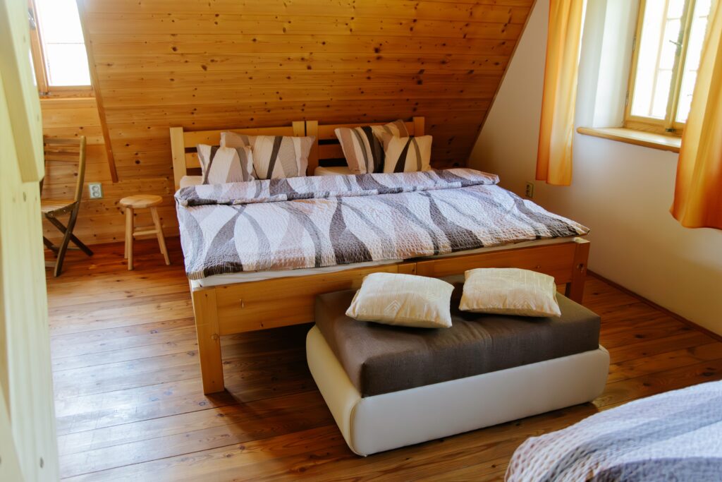 • Patro – koupelna s vanou a WC, pokoj se třemi lůžky a další pokoj se dvěma lůžky, který je přístupný z ložnice po chalupářských schodech do podkroví.