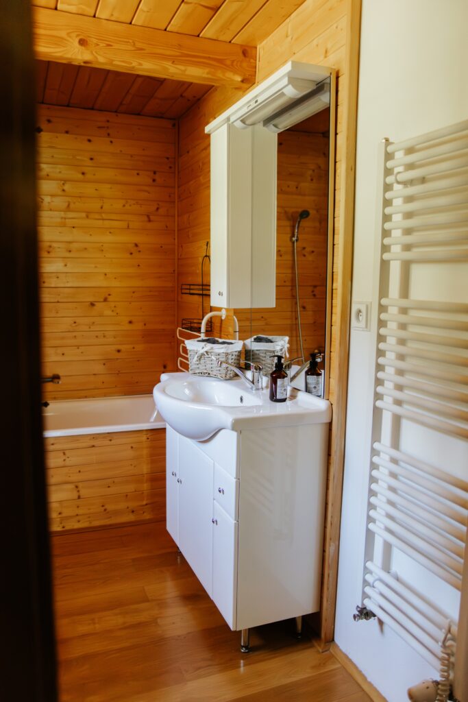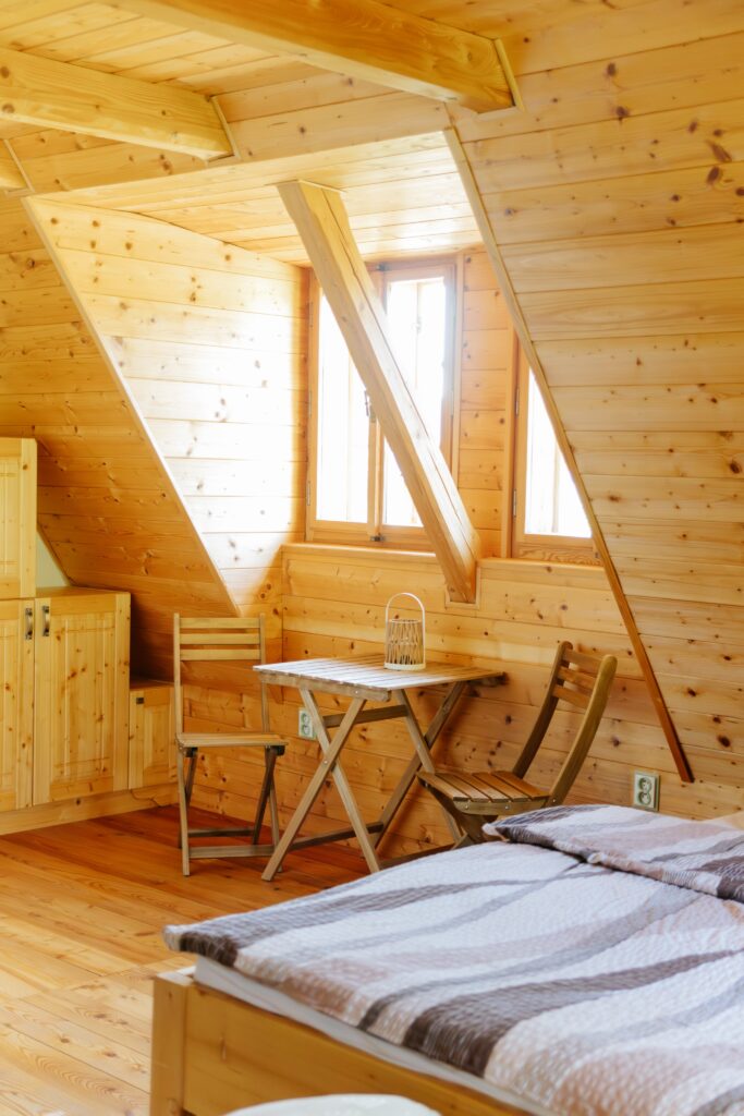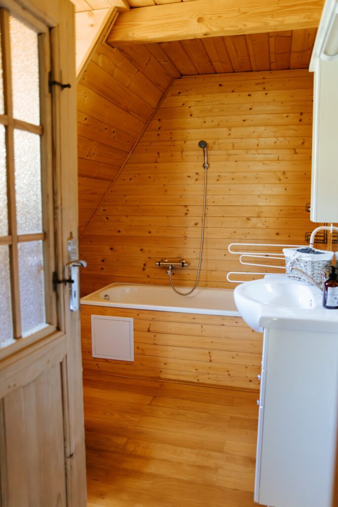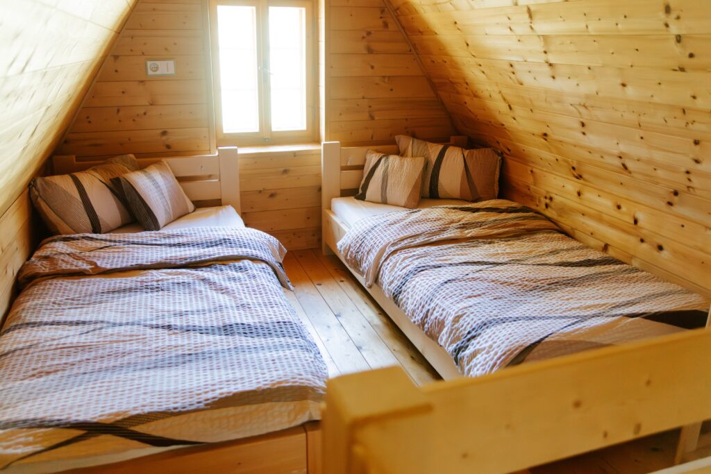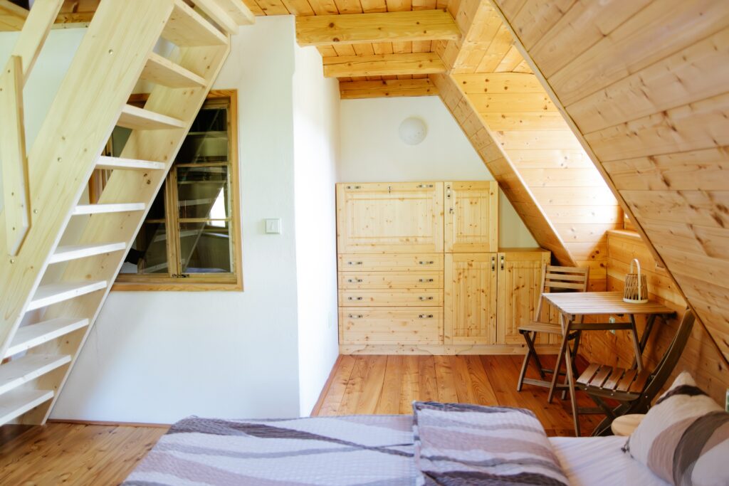 • Patro – koupelna s vanou a WC, pokoj se třemi lůžky a další pokoj se dvěma lůžky, který je přístupný z ložnice po chalupářských schodech do podkroví.